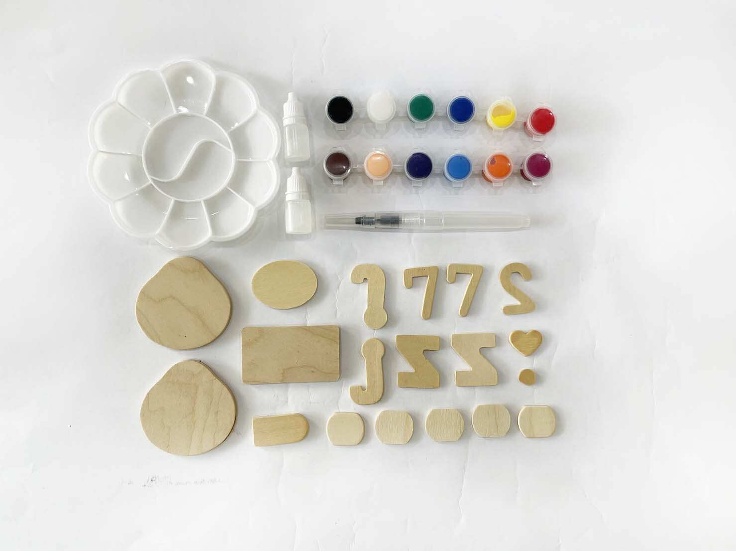 木片、彩繪水筆、壓克力顏料條X2條、調色盤、保麗龍膠